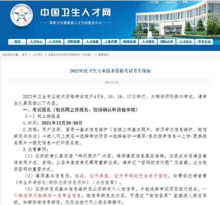 2022年度卫生资格考试报名时间:2021年12月20日-30日