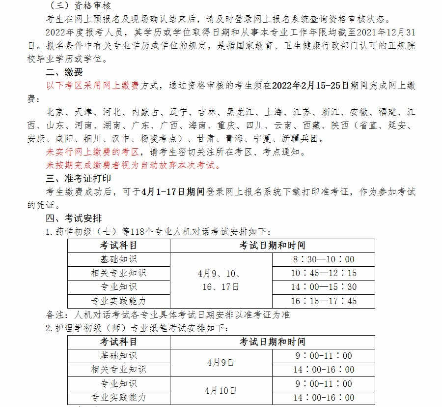 2022年度卫生资格考试考试时间:2022年4月9、10、16、17日