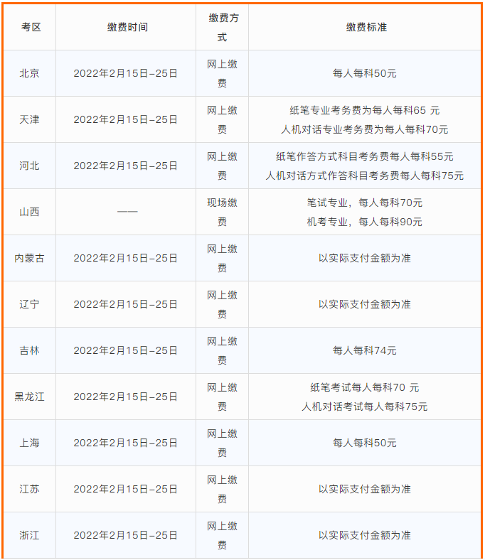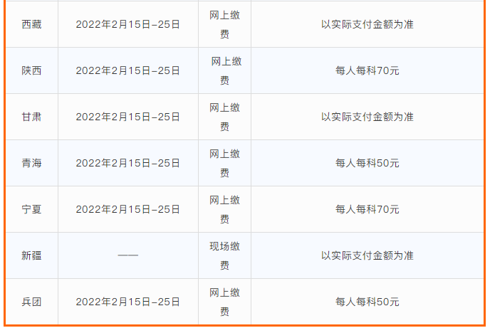 北京、天津、河北、内蒙古、辽宁、吉林、黑龙江、上海、江苏、浙江、安徽、福建、江西、山东、河南、湖南、广东、广西、海南、重庆、四川、西藏、宁夏、新疆兵团考区开通了网上缴费功能。