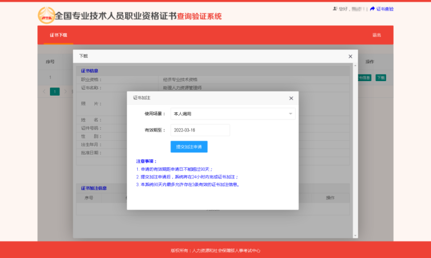 按提醒选择使用场景、加注有效期,点击[提交加注申请]按钮,完成证书加注申请。