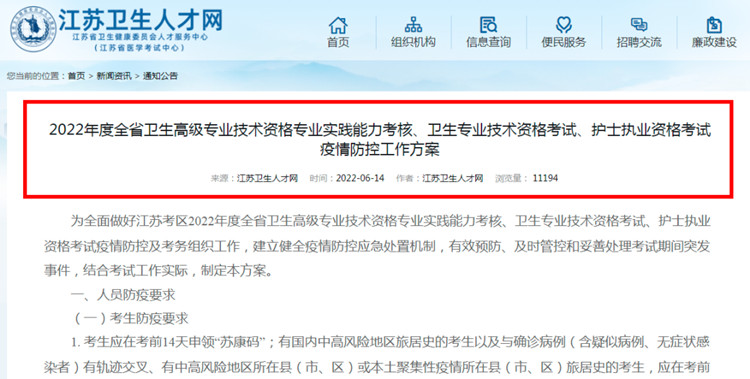 江苏省卫生人才网公布:关于江苏考区2022年度卫生专业技术资格考试、护士执业资格考试疫情防控及考务组织工作,建立健全疫情防控应急处置机制,有效预防、及时管控和妥善处理考试期间突发事件,结合考试工作实际,制定本方案。