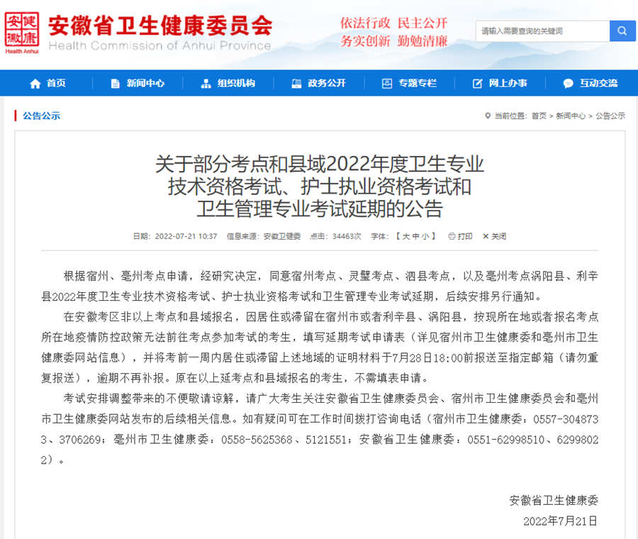 根据宿州、亳州考点申请,经研究决定,同意宿州考点、灵璧考点、泗县考点,以及亳州考点涡阳县、利辛县2022年度卫生专业技术资格考试、护士执业资格考试和卫生管理专业考试延期,后续安排另行通知。