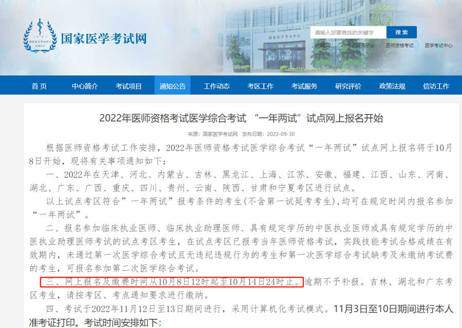 根据医师资格考试工作安排,2022年医师资格考试医学综合考试“一年两试”试点网上报名将于10月8日开始,现将有关事项通知如下: